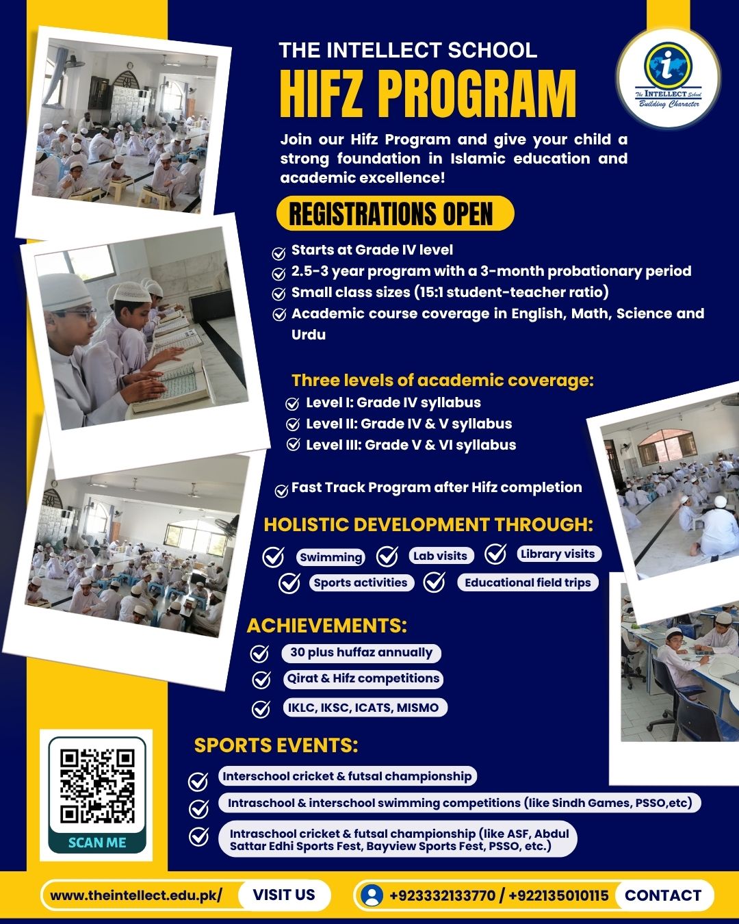Admissions Open Hifz Program for the academic session 2026-27 Announcements News & Updates October 15, 2025 Secure your child’s future with a strong foundation in both Deen and Duniya!The Intellect School is thrilled to announce that REGISTRATIONS ARE OPEN for our acclaimed Hifz Program! Don’t miss the chance to enroll your child in a program that builds both character and intellect. Contact Us:– 021-35110101-7– admissions@theintellect.edu.pk– ST-1, Survey 40 & 43A-B, Ibrahim Hydery, Korangi, Karachi Apply now and give your child a head start!  Online Registration Link: https://erp.theintellect.edu.pk/…/Student/WebsiteInquiry < Back to news and events